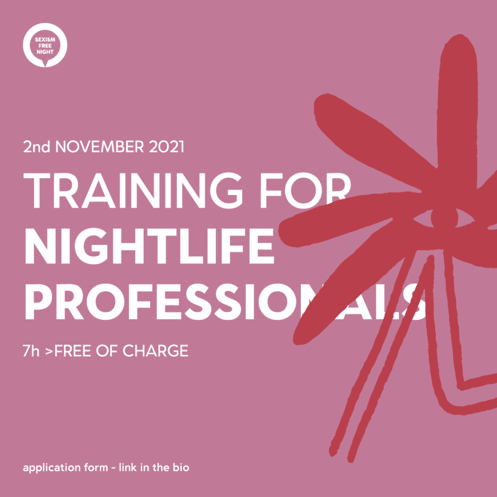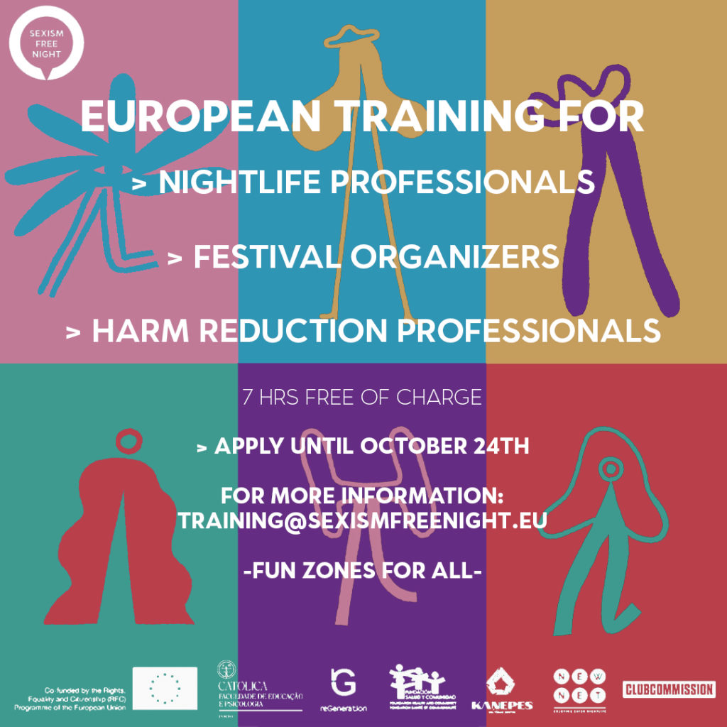Apply now for the Sexism Free Night EU Trainings. The 3 training courses are aimed at collaborators in the nightlife sector in Europe (nightlife professionals, festival organizers and drug field professionals) and intend to build competence to prevent and respond to sexualized violence in nightlife. The participants in the trainings can have a role as future leaders in the promotion of a safer and more egalitarian environment as well as to pass on the acquired knowledge to other employees in the form of training.